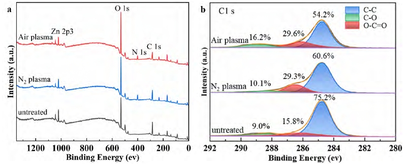 采用XPS測(cè)試技術(shù)進(jìn)一步研究等離子體射流處理前后鋁合金基體表面的化學(xué)成分變化。由圖1.4a中的XPS全譜圖表明等離子體清洗前后的基體表面出現(xiàn)了Zn2p3、O1s、N1s及C1s峰,其相應(yīng)的中心位置分別位于1021.8eV、531.8eV、400.8eV和284.8eV。在經(jīng)過(guò)等離子體清洗后,C1s峰的相對(duì)強(qiáng)度出現(xiàn)不同程度的降低,而O1s峰強(qiáng)度明顯提升。此外,經(jīng)過(guò)空氣等離子體清洗后的基體上O1s峰強(qiáng)度高于氮?dú)獾入x子體。在氮?dú)?空氣等離子處理過(guò)程中,N2的電離導(dǎo)致含氮官能團(tuán)(如N-H和N-O)吸附于鋁合金表面,從而在基體表面出現(xiàn)N1s峰。
