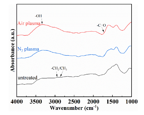 為了研究氮?dú)?空氣等離子體對(duì)鋁合金表面的改性效果,對(duì)改性前后的基體進(jìn)行了紅外測(cè)試分析。圖1.5為等離子體清洗前后的鋁合金表面的ATR-FTIR圖譜。原始鋁合金表面的紅外光譜在2925和2867cm-1區(qū)域?qū)?yīng)-CH2/CH3基團(tuán)的彎曲振動(dòng),此為有機(jī)吸附物的特征峰。從圖譜中可以看出,經(jīng)氮?dú)?空氣等離子體改性后基體表面上的-CH2/CH3特征峰強(qiáng)度明顯下降,表明等離子體清洗可有效降低基體表面的碳?xì)湮锏奈?。同時(shí),在譜圖1717cm-1區(qū)域檢測(cè)出了微弱伸縮振動(dòng)吸收峰,其為具有親水特性的-C=O官能團(tuán)。鋁合金經(jīng)氮?dú)夂涂諝獾入x子體清洗后,在3100~3600cm-1區(qū)域均出現(xiàn)了明顯的-OH的伸縮振動(dòng)吸收峰。這揭示了在等離子處理過(guò)程中,由于電離作用而在基體表面引入羥基等含氧極性基團(tuán)。另外,相較于氮?dú)獾入x子體而言,空氣等離子體清洗后的伸縮振動(dòng)吸收峰強(qiáng)度更高,意味著在基體表面引入了更多數(shù)量的-OH基團(tuán)。相比于原始鋁合金基體,經(jīng)等離子體改性后的基體吸附的極性基團(tuán)可以極大改善表面的親水性,以至于出現(xiàn)超親水特征。